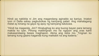 Magbigay ng tiyak na mga halimbawa kung paano mo ito isasabuhay. Hindi alam ni Delia kung anong regalo ang ibibigay niya sa asawang si jim. Henry Maikling Kuwento Estados Unidos Salin sa Filipino ni Rufino Alejandro Piso at walamput pitong sentimos.