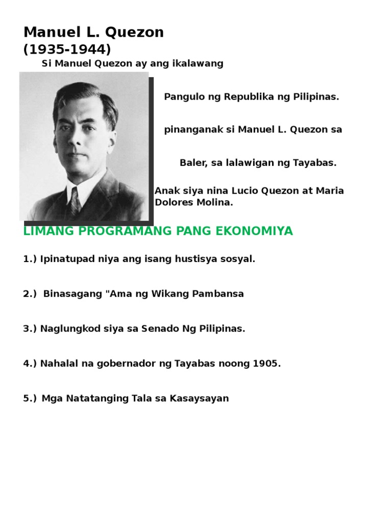 Siya ang kinilala bilang ikalawang pangulo ng Pilipinas kasunod ni Emilio Aguinaldo. Sa Bisa ng batas na ito ay ipinahayag ni Pangulong Manuel L. Mga nagawa ni manuel l quezon ANO ANG MGA NAGAWA NI MANUEL QUEZON SA BAYAN.